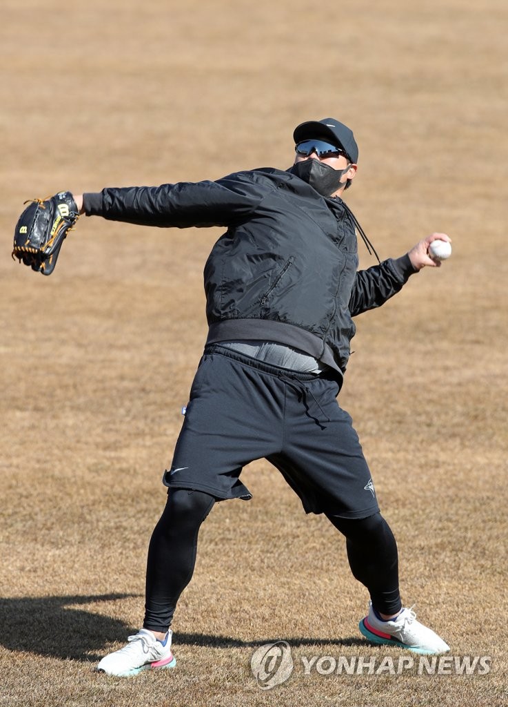 | ▲ In this file photo from Feb. 3, 2022, Ryu Hyun-jin of the Toronto Blue Jays plays catch during a practice session for his former South Korean club, Hanwha Eagles, at Hacheong Sports Town in Geoje, some 400 kilometers south of Seoul. (Yonhap) |