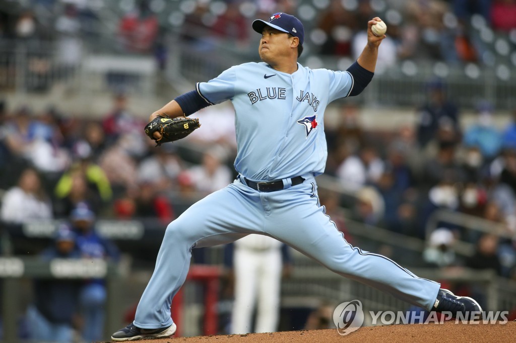 ▲ c In this USA Today Sports photo via Reuters, Ryu Hyun-jin of the Toronto Blue Jays pitches against the Atlanta Braves in the bottom of the first inning of a Major League Baseball regular season game at Truist Park in Atlanta on May 12, 2021. (Yonhap)