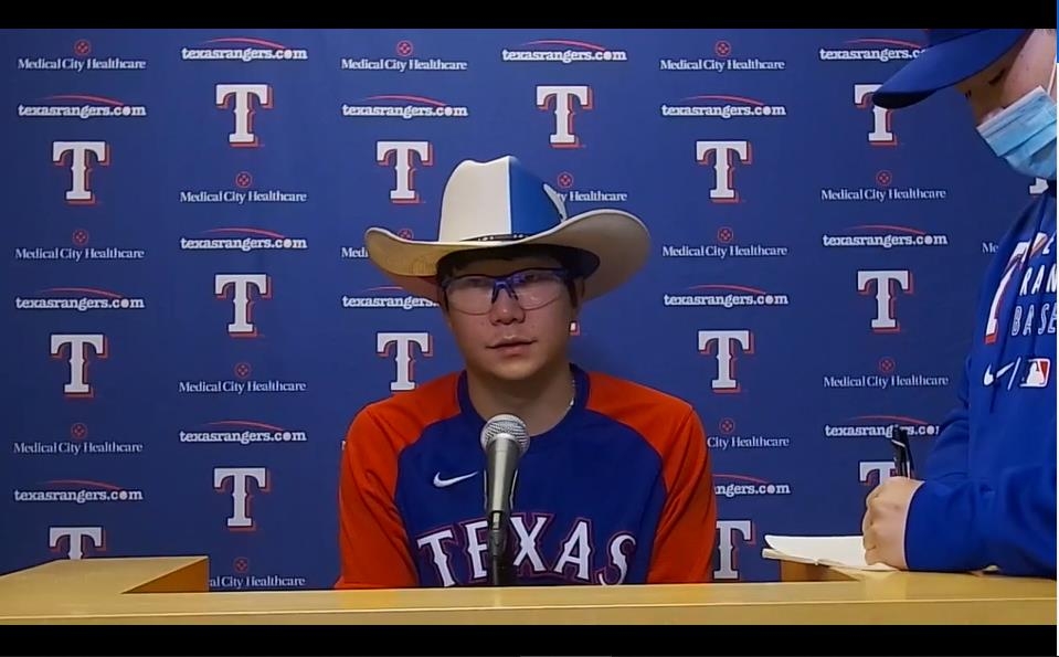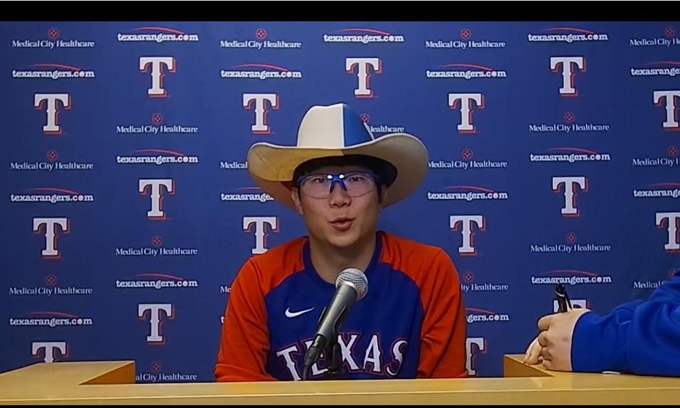 | ▲ 카우보이모자 쓰고 화상 인터뷰하는 양현종 (서울=연합뉴스) 텍사스 레인저스 한국인 투수 양현종이 6일(한국시간) 미국 미네소타주 미니애폴리스 타깃필드에서 열린 미네소타 트윈스와의 방문 경기를 마치고, 화상 인터뷰를 하고 있다. [텍사스 레인저스 화상 인터뷰 캡처. 재판매 및 DB 금지] |