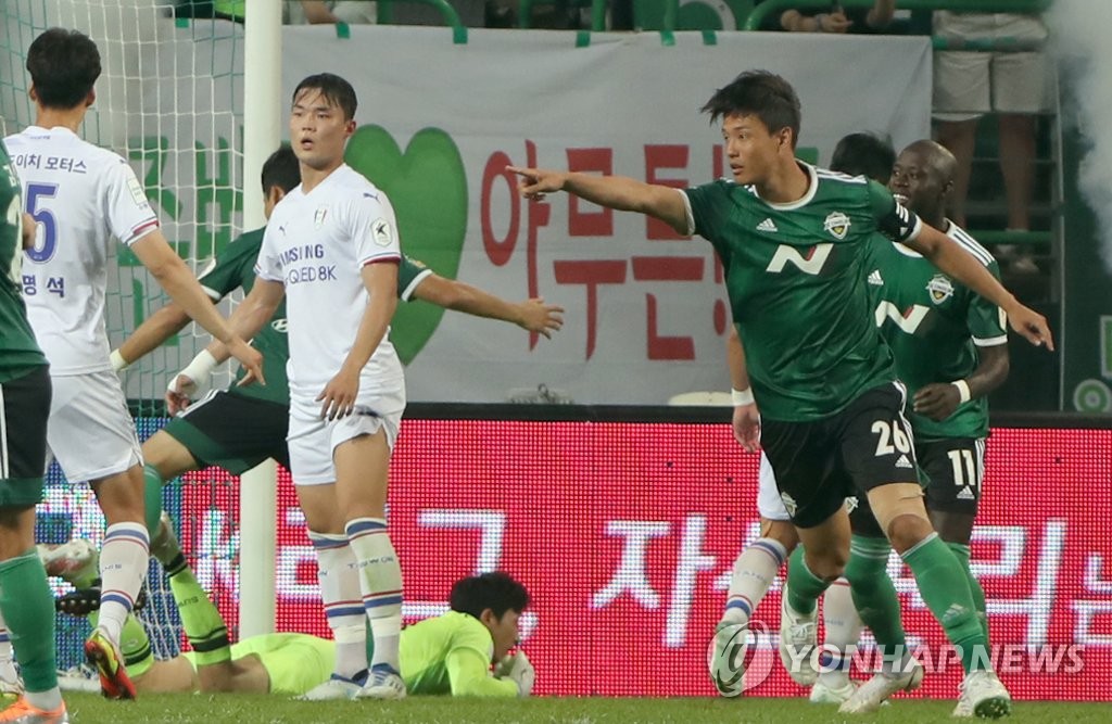 | ▲  In this May 28, 2022, file photo provided by the Korea Professional Football League, Joo Min-kyu of Jeju United celebrates his goal against Jeonbuk Hyundai Motors during the clubs' K League 1 match at Jeonju World Cup Stadium in Jeonju, 200 kilometers south of Seoul. (PHOTO NOT FOR SALE) (Yonhap) |