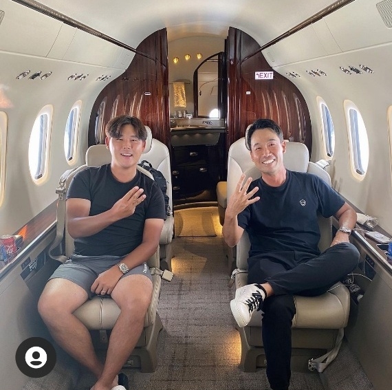 특히 그는 "파4홀 최다 타수 기록 보유자 케빈 나(미국)가 내 옆에 있다"면서 다음 대회가 열리는 미국 노스캐롤라이나주로 향하는 전세 자가용 비행기 안에서 찍은 것으로 보이는 사진을 곁들였다.
