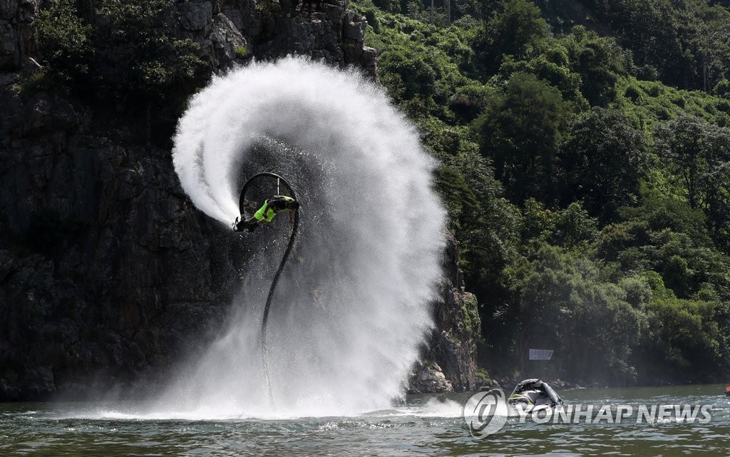 | ▲ 더위를 날려라 (홍천=연합뉴스) 양지웅 기자 = 25일 강원 홍천군 서면 홍천강에서 한 피서객이 플라이보드를 타며 여름을 즐기고 있다. 2021.7.25 yangdoo@yna.co.kr |