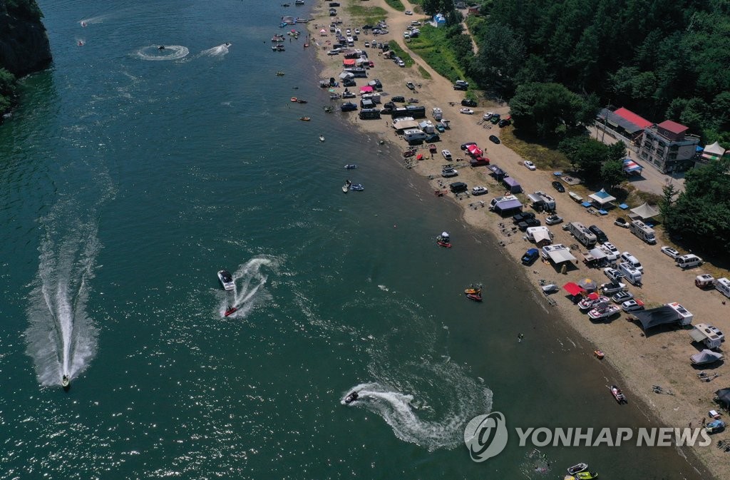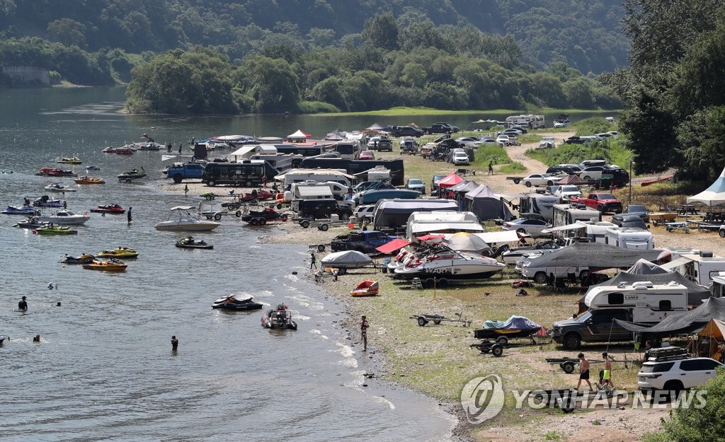| ▲ 캠핑카 몰린 홍천강 (홍천=연합뉴스) 양지웅 기자 = 25일 강원 홍천군 서면 홍천강이 피서객과 캠핑카로 붐비고 있다. 2021.7.25 yangdoo@yna.co.kr |