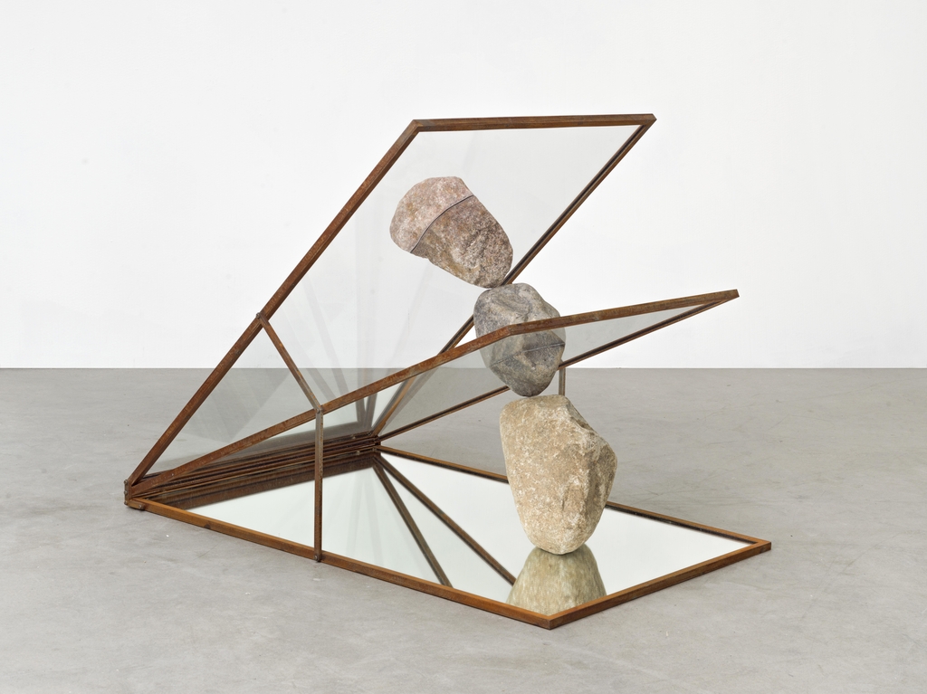 돌 3개를 나란히 놓은 작품에서는 가운데 돌이 실제 돌이고, 양쪽 돌은 청동 복제본이다. 돌 사이에 이번에도 양면 거울이 있다. 관람객 시점에 따라 보이는 돌들은 진짜일 수도, 아닐 수도 있다. 무엇을 보느냐에 따라 우리의 관점도 달라짐을 말하는 작업이다.