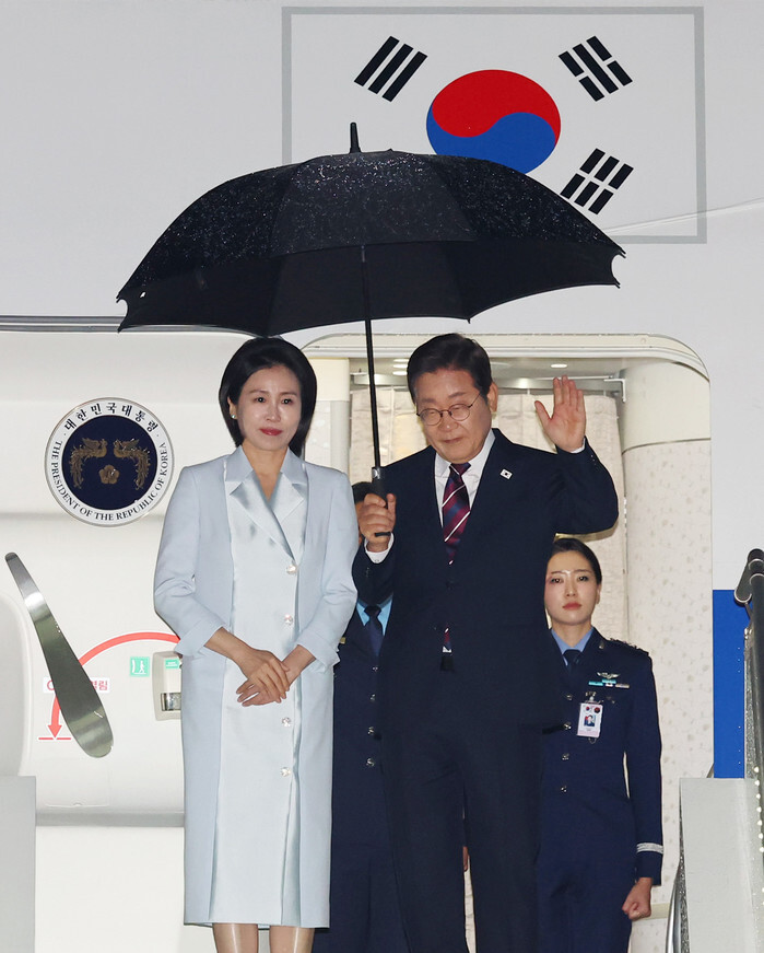 South Korean President Lee Jae Myung (C), accompanied by his wife, Kim Hye Kyung (L), heads home from Calgary International Airport in Calgary, Canada, on June 17, 2025, after attending the Group of Seven summit. (Yonhap)