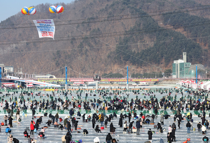 Visitors enjoy ice fishing at the 2025 Hwacheon Sancheoneo Ice Festival in Hwacheon, Gangwon Province, on Jan. 12, 2025. (Yonhap)