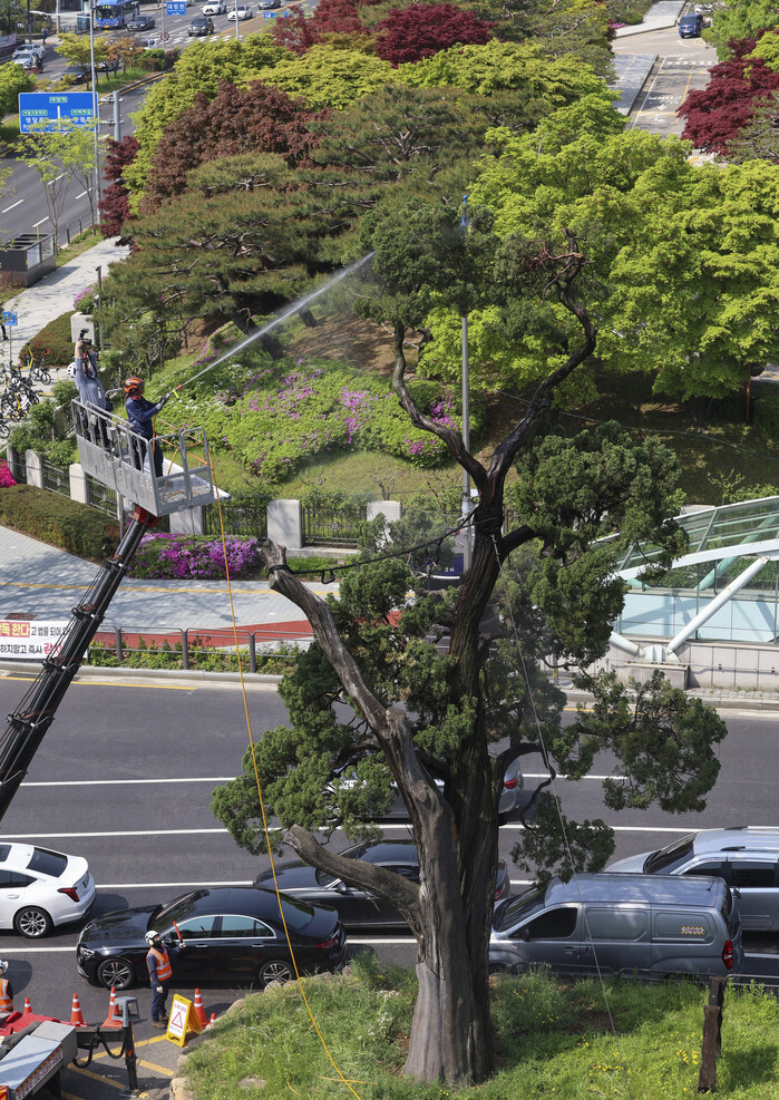 A worker of an arboreal treatment company sprays water on a juniper tree, believed to more than 880 years old and the oldest one in Seoul, at an intersection in the capital's Seocho Ward on April 24, 2025. (Pool photo) (Yonhap)