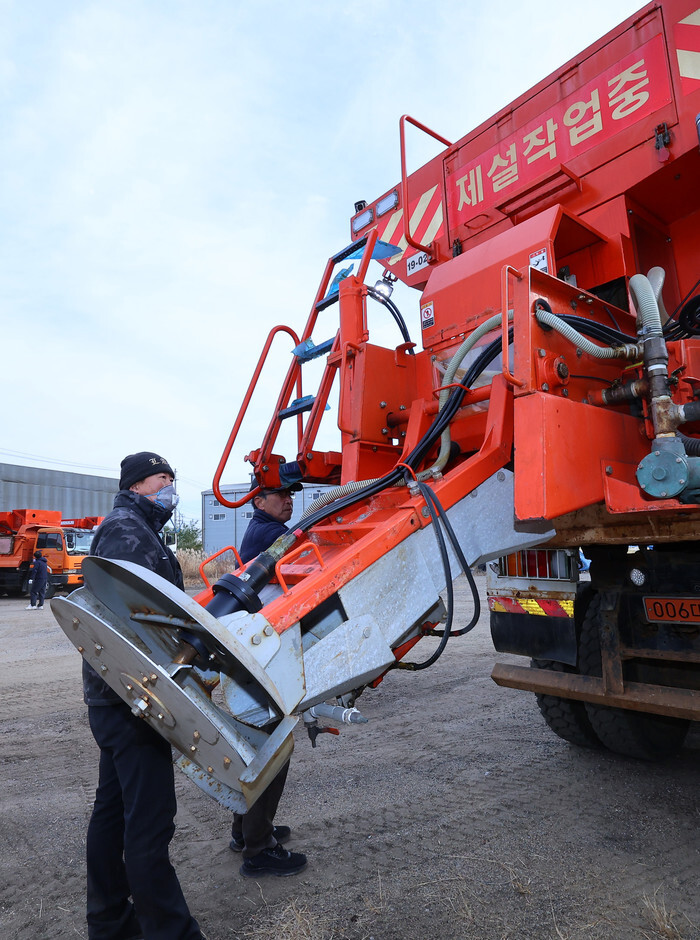 A municipality worker checks a snowplow in Incheon, west of Seoul, on Nov. 17, 2025, to prepare for snow removal in the winter season across the country. (Yonhap)