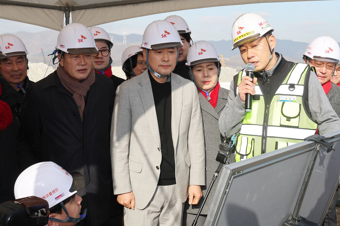 Jang Dong-hyeok (C), leader of the main opposition People Power Party, visits the construction site of a new chip cluster project, implemented by South Korean conglomerate SK Group, in Yongin, south of Seoul, on Jan. 9, 2026. (Yonhap)