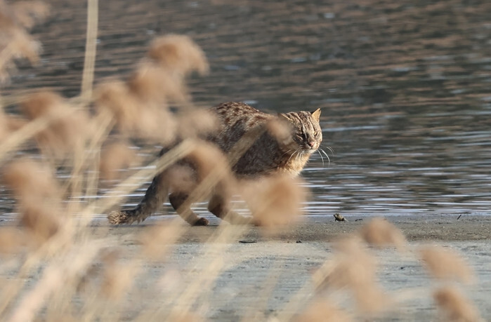 A leopard cat, an endangered species called "sak" in Korean, searches for prey along a stream in Gangneung, Gangwon Province, northeastern South Korea, on Feb. 18, 2025. In South Korea, the animal is listed as Class II endangered wildlife feared to be threatened with imminent extinction. (Yonhap)