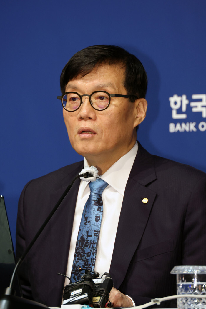 Bank of Korea Gov. Rhee Chang-yong attends a press conference at the central bank in Seoul on April 17, 2025, after the central bank kept its benchmark interest rate unchanged, despite sluggish growth, in an effort to stabilize the local currency amid uncertainties regarding the United States' sweeping tariff scheme. (Pool photo) (Yonhap)