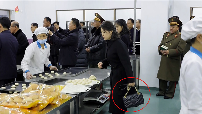 Ri Sol-ju (C), wife of North Korean leader Kim Jong-un, carries what appears to be a Gucci GG Marmont mini shoulder bag (circled in red), as she accompanies Kim with her daughter Ju-ae during his inspection of an industrial complex in Kangdong County on the outskirts of Pyongyang on Dec. 15, 2025, in this photo captured from the North's official Korean Central Television the next day. (For Use Only in the Republic of Korea. No Redistribution) (Yonhap)