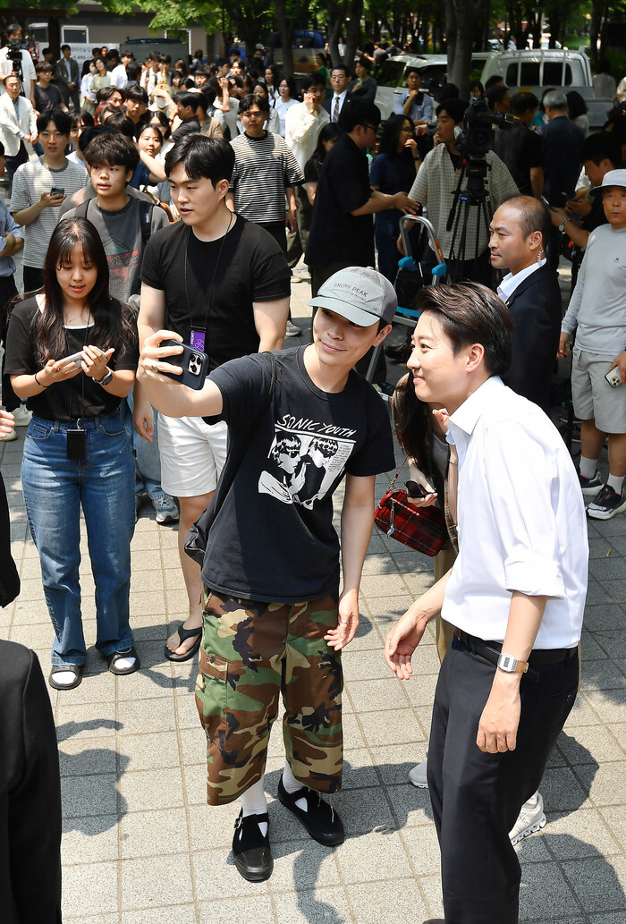 Lee Jun-seok (R), the presidential candidate of the minor conservative New Reform Party, takes a selfie with a supporter during a campaign stop at a park in Seoul's Mapo Ward on May 30, 2025, ahead of the June 3 presidential election. (Pool photo) (Yonhap)
