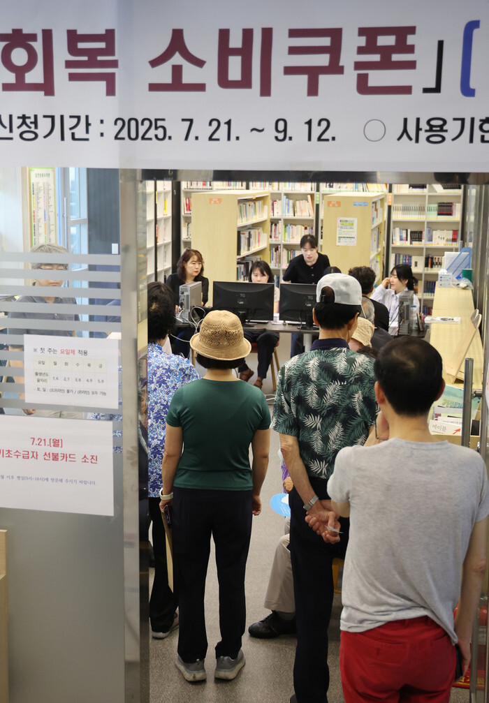 People wait in line to apply for cash handouts, called "consumption coupons," from the government in the southeastern port city of Busan on July 21, 2025. As part of a government initiative aimed at stimulating domestic consumption, all South Korean citizens residing in the country as of June 18 will receive a one-time payment of 150,000 won, with additional targeted assistance to be provided based on income levels. (Yonhap)