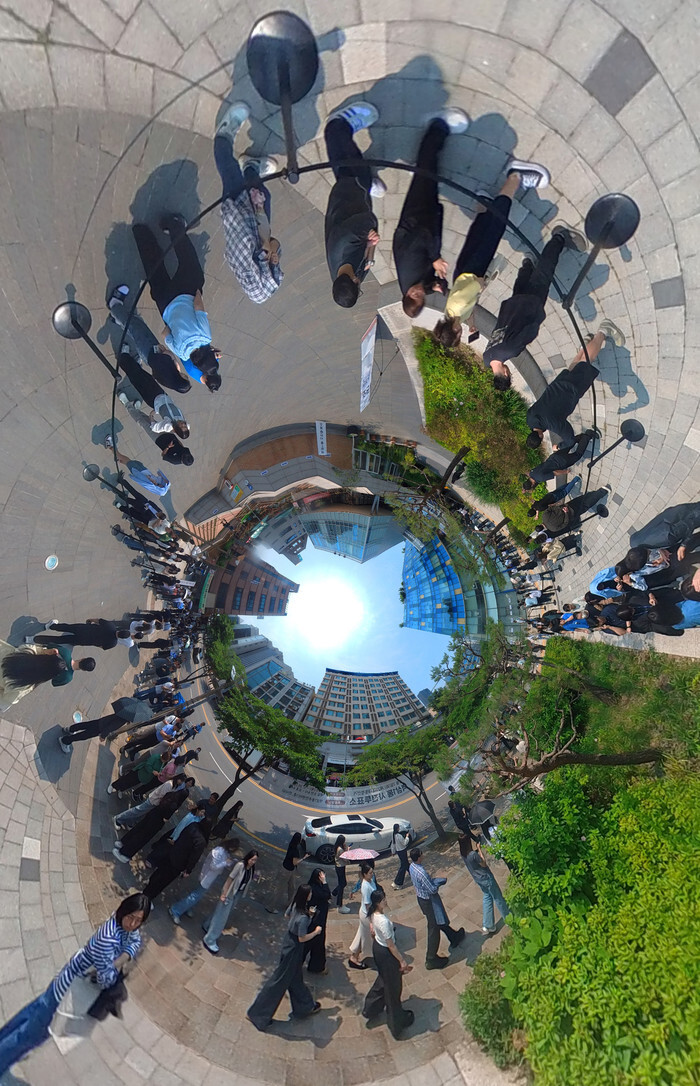 This photo, taken with a 360-degree camera on a drone on May 29, 2025, shows voters forming a long line during lunchtime to cast early votes at a polling station in Seoul's Gangnam Ward for the June 3 presidential election. (Yonhap)