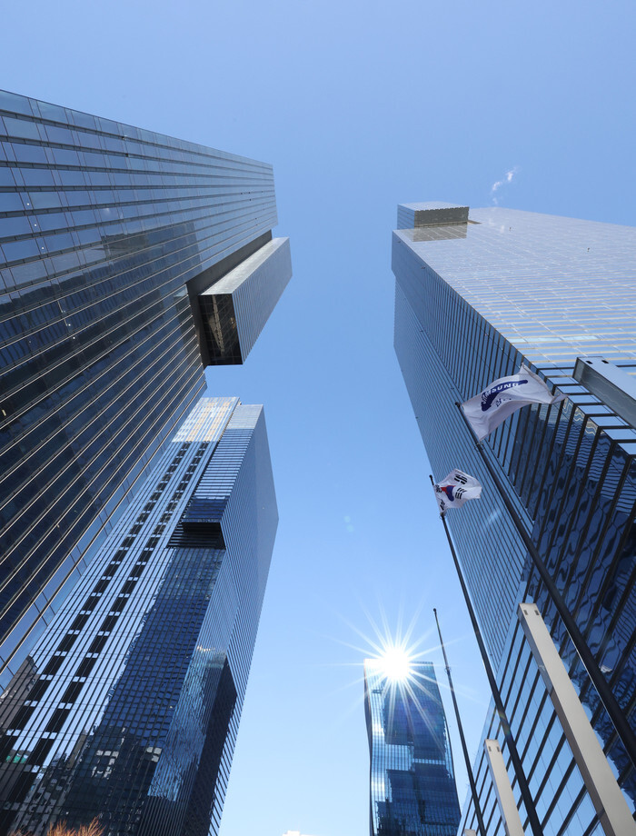 A flag of Samsung Electronics Co., the world's largest maker of computer memory chips and smartphones, flutters outside its headquarters in Seoul on Jan. 8, 2026. Samsung reported a record-breaking operating profit for the fourth quarter of 2025, touching the 20 trillion-won (US$13.8 billion) mark for the first time, driven by a supercycle in the chip industry. (Yonhap)