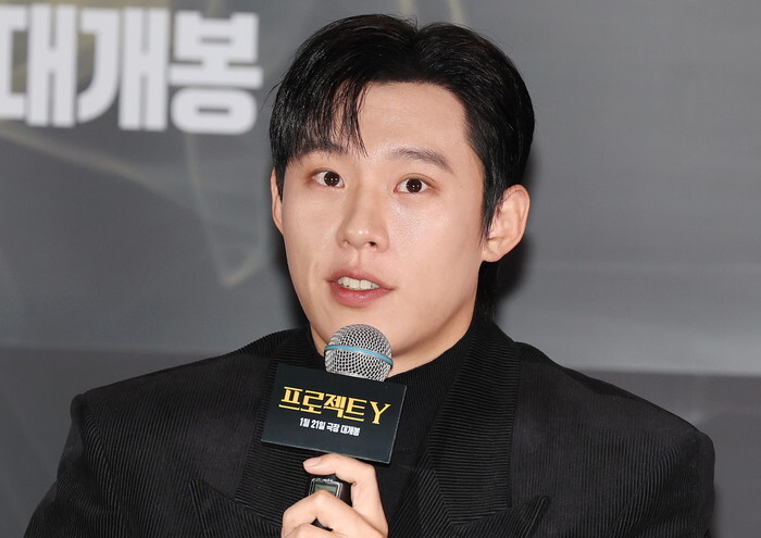South Korean actor Kim Sung-chul, who stars in the new movie "Project Y," speaks during a publicity event in Seoul on Jan. 8, 2026, to promote the movie, set to hit local screens in South Korea on Jan. 21. (Yonhap)