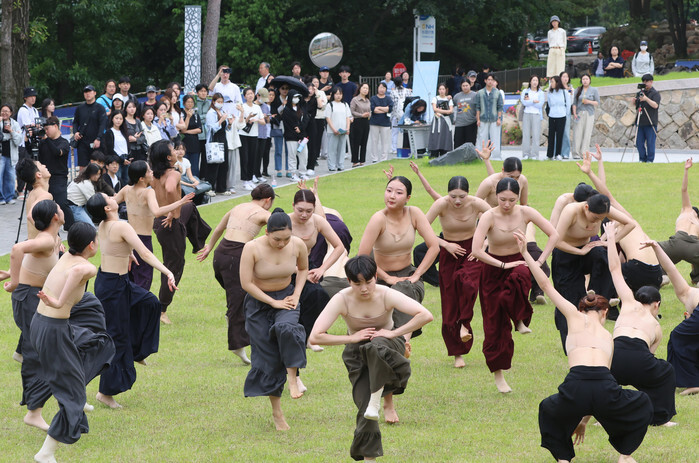 Students from Pusan National University's Department of Dance perform a group dance on the campus in the southeastern city of Busan on May 22, 2025. (Yonhap)