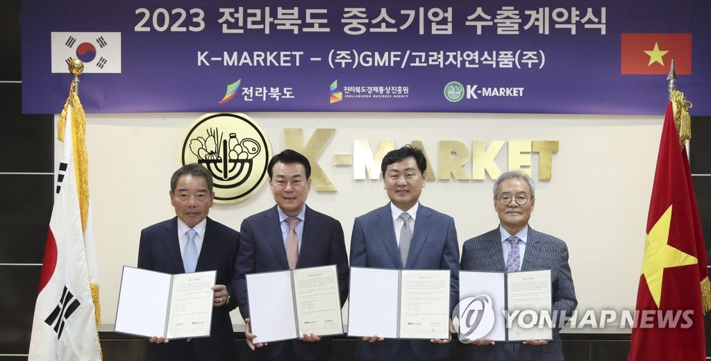 전북도에 따르면 사절단은 이날 베트남 하노이에 있는 K-마켓 본사를 방문해 지역 식품업체 지엠에프와 고려자연식품이 생산한 만두와 유자차를 수출하는 내용의 계약을 맺었다.
