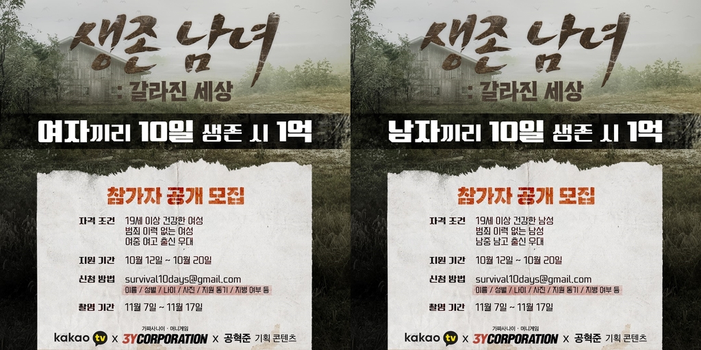 ▲ 카카오엔터, '생존 남녀: 갈라진 세상' 출연자 모집 = 카카오엔터테인먼트가 총 1억원의 상금을 걸고 남녀가 한 팀으로 생존 경쟁을 펼치는 서바이벌 프로그램 '생존 남녀 : 갈라진 세상'에 참여할 출연자들을 공개 모집한다.