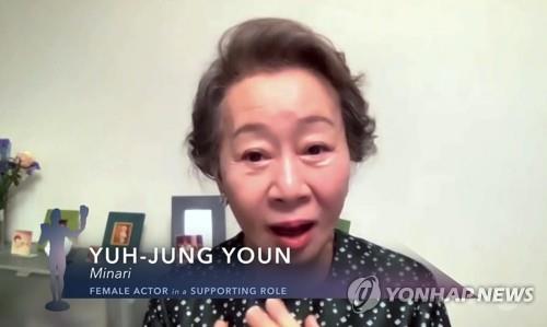 (샌프란시스코·서울=연합뉴스) 정성호 특파원 강애란 기자 = 영화 '미나리'에 출연한 배우 윤여정이 4일(현지시간) 미국배우조합상(SAG) 여우조연상을 받았다.