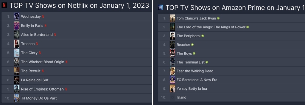 2일 온라인 콘텐츠 서비스 순위 집계 사이트 플릭스 패트롤에 따르면 전날 기준으로 '더 글로리'와 '아일랜드'가 각각 넷플릭스와 아마존프라임비디오 TV 프로그램 부문 세계 5위와 10위를 기록했다. 두 작품 모두 지난달 30일 공개된 지 이틀 만이다.
