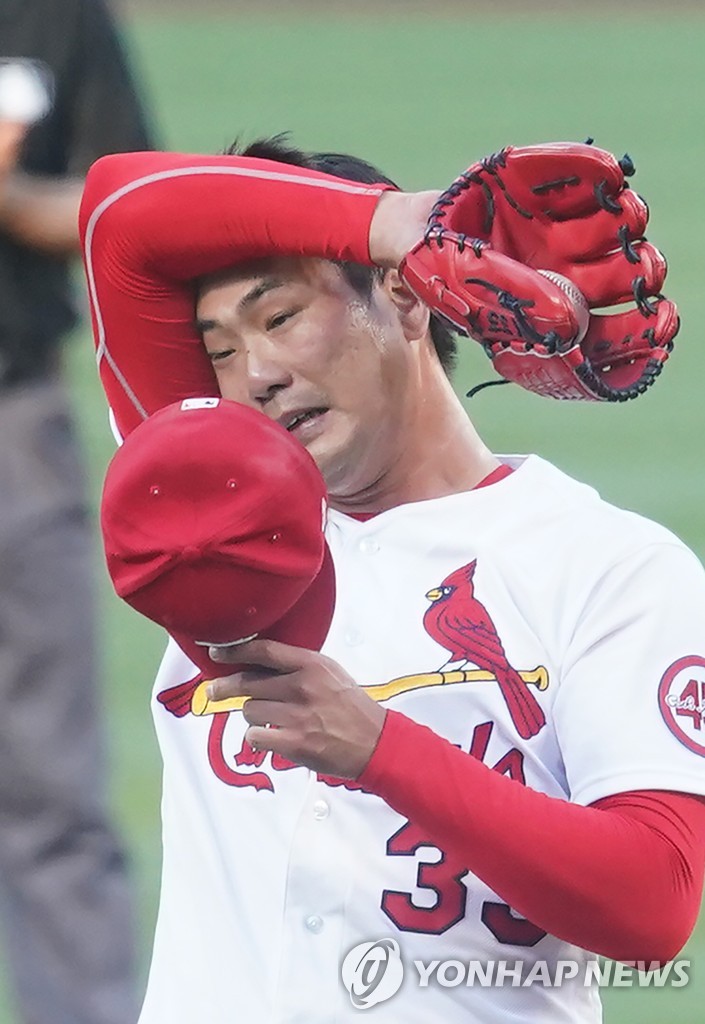 | ▲ In this UPI photo, Kim Kwang-hyun of the St. Louis Cardinals wipes his face after walking Trevor Rogers of the Miami Marlins in the top of the second inning of a Major League Baseball regular season game at Busch Stadium in St. Louis on June 15, 2021. (Yonhap) |