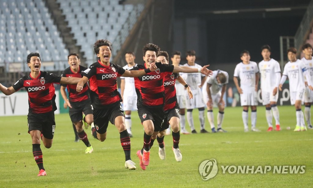 | ▲ In this file photo from Oct. 20, 2021, Pohang Steelers players celebrate their victory over Ulsan Hyundai FC on penalties in the semifinals of the Asian Football Confederation Champions League at Jeonju World Cup Stadium in Jeonju, 240 kilometers south of Seoul. (Yonhap) |
