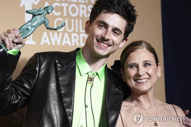 | ▲ SAG 어워즈 남우주연상 받은 티모테 샬라메와 그의 어머니 니콜 플렌더 [AP 연합뉴스. 재판매 및 DB 금지] |
