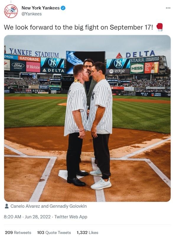 | ▲ 카넬로 알바레스(왼쪽)와 게나디 골로프킨의 시구를 전한 뉴욕 양키스 [뉴욕 양키스 트위터 캡처. 재판매 및 DB 금지] |