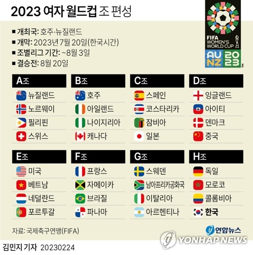 | ▲ [그래픽] 2023 여자 월드컵 조 편성 (서울=연합뉴스) 김영은 기자 = 2023 국제축구연맹(FIFA) 호주-뉴질랜드 여자 월드컵에 나서는 32개 팀이 최종 확정됐다. FIFA는 지난달 23일(현지시간) 홈페이지를 통해 파나마, 아이티, 포르투갈이 합류하면서 대회에 나서는 32개 팀이 모두 정해졌다고 밝혔다. 0eun@yna.co.kr 트위터 @yonhap_graphics 페이스북 tuney.kr/LeYN1 |