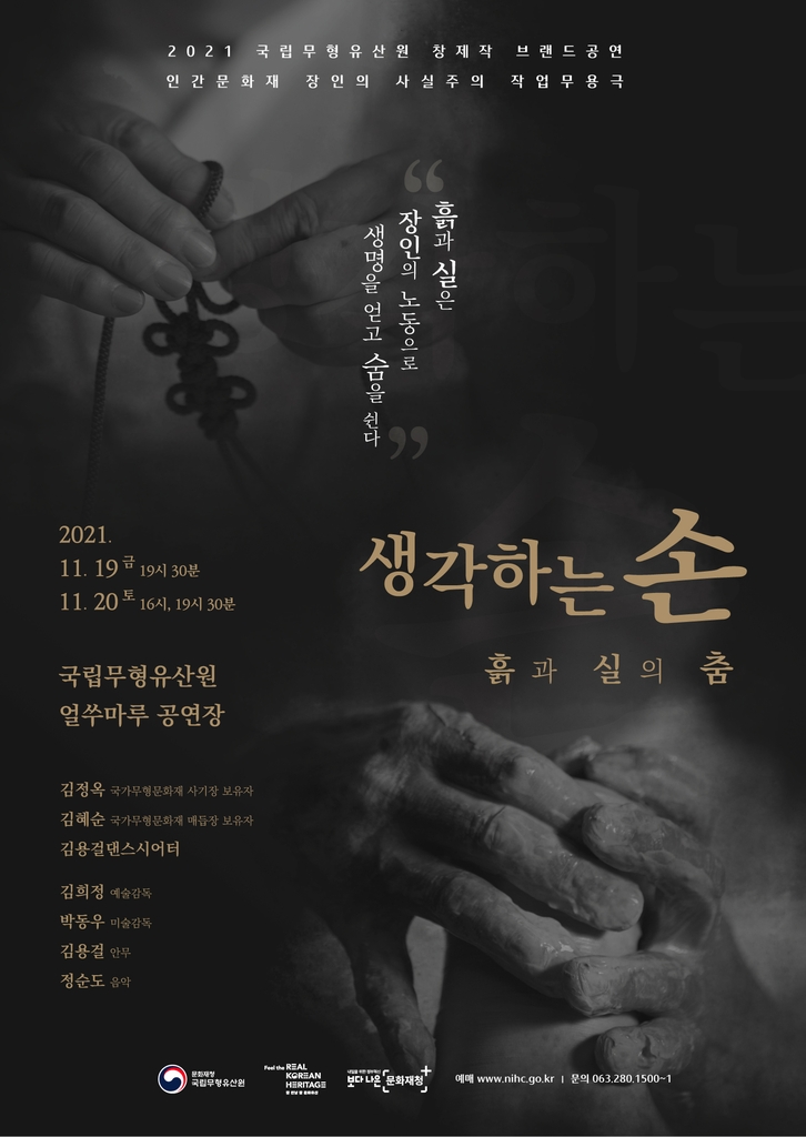 ▲ 국립무형유산원, 브랜드 공연·책마루 전시 = 국립무형유산원은 오는 19∼20일 얼쑤마루 대공연장에서 첫 브랜드 공연 '생각하는 손 - 흙과 실의 춤'을 상연한다.