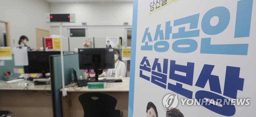 | ▲ This file photo, taken June 30, 2022, shows a banner set up at an agency designed to support small merchants in Seoul that says pandemic-hit merchants can apply for state compensation for their losses caused by the government's virus restrictions. (Yonhap) |