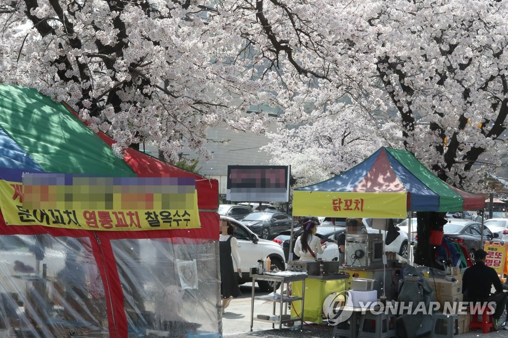 | ▲ 벚나무 아래 노점상 지난 1일 벚꽃이 흐드러지게 핀 충남 공주시 반포면 학봉리 동학사 입구 일대에서 노점상들이 영업하는 모습 [연합뉴스 자료사진] |