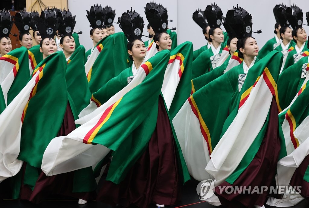 | ▲ 창작공연 '일무' 2막 1장 '춘앵무' 시연 (서울=연합뉴스) 이재희 기자 = 25일 오전 서울 종로구 세종문화회관 예술동에서 열린 '일무' 연습 공개 행사에서 서울시무용단이 공연 일부를 시연하고 있다. 종묘 제례무를 모티프로 한 이 창작공연은 5월 25일부터 나흘간 세종문화회관 대극장에서 열린다. 2023.4.25 scape@yna.co.kr |