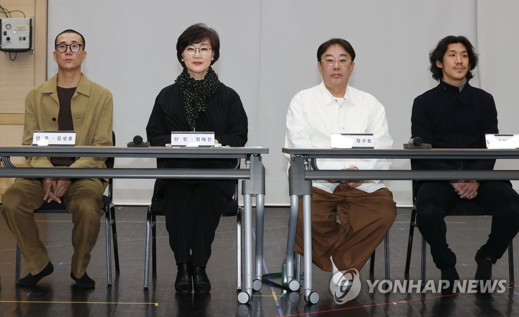 | ▲ 공연 '일무' 제작진 (서울=연합뉴스) 이재희 기자 = 25일 오전 서울 종로구 세종문화회관 예술동에서 열린 창작공연 '일무' 연습 공개 행사에 안무가 김성훈(왼쪽부터), 정혜진 단장, 정구호 연출, 안무가 김재덕이 참석하고 있다. 2023.4.25. 2023.4.25 scape@yna.co.kr |