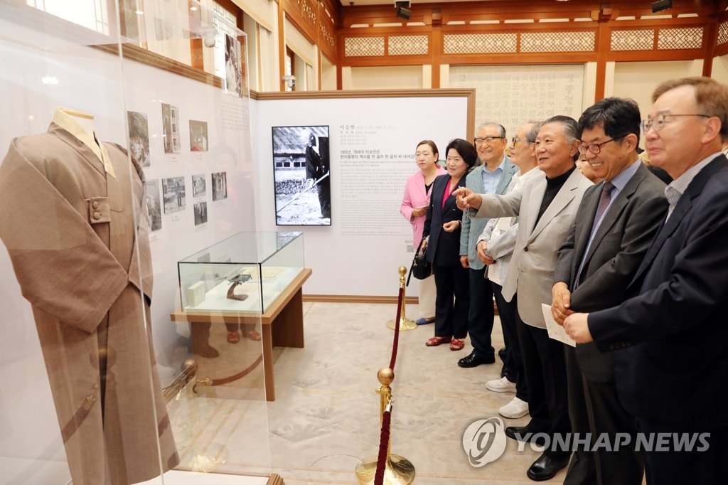 (서울=연합뉴스) 이은정 기자 = 김대중 전 대통령 아들인 김홍업 김대중평화센터 이사장과 신철식 전 이승만건국대통령기념사업회 회장이 청와대에서 열리고 있는 역대 대통령 전시를 관람했다.