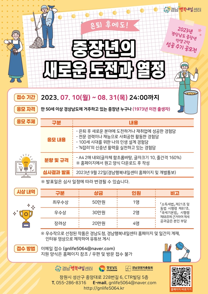 공모전 참가는 50세 이상(1973년 이전 출생자) 도민 누구나 8월 31일까지 경남행복내일센터 누리집(http://gnlife5064.kr)에서 온라인으로 신청하면 된다.
