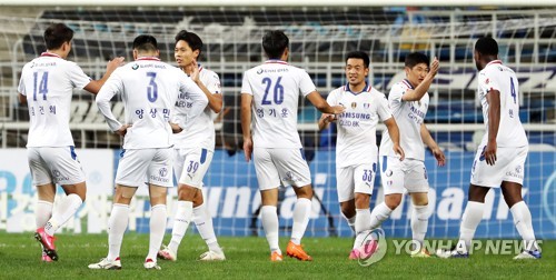| ▲ In this file photo from Oct. 4, 2020, Suwon Samsung Bluewings' players celebrate their 1-0 victory over Incheon United in a K League 1 match at Incheon Football Stadium in Incheon, 40 kilometers west of Seoul. (Yonhap) |