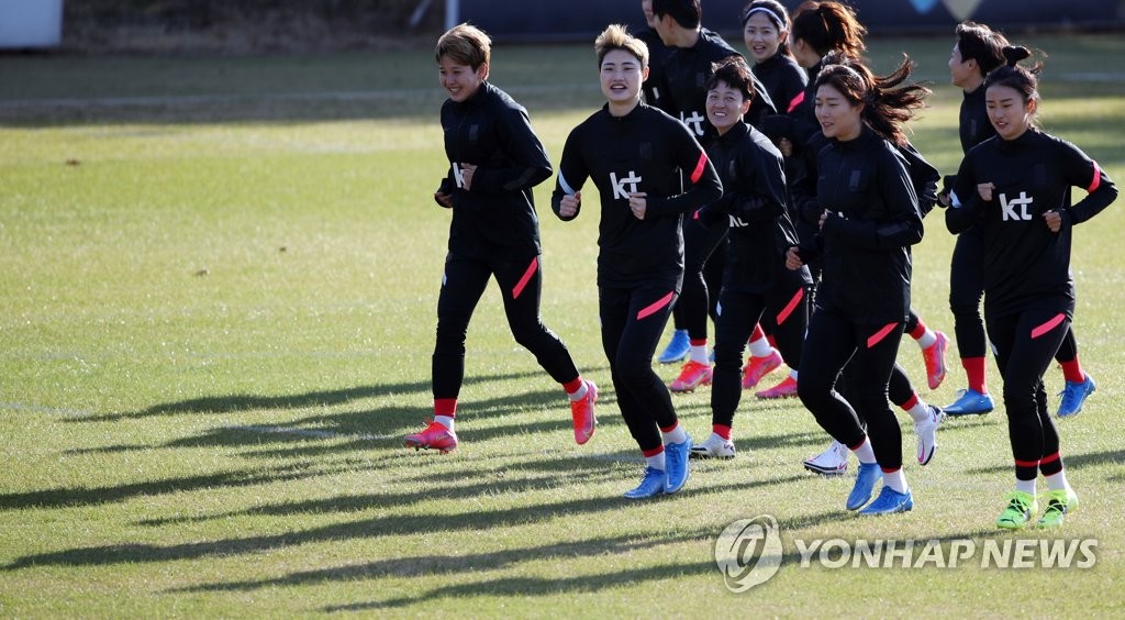 | ▲ In this file photo from March 22, 2021, South Korean women's national football team players warm up before practice at the National Football Center in Paju, Gyeonggi Province, in preparation for Olympic qualifying playoff matches against China. (Yonhap) |