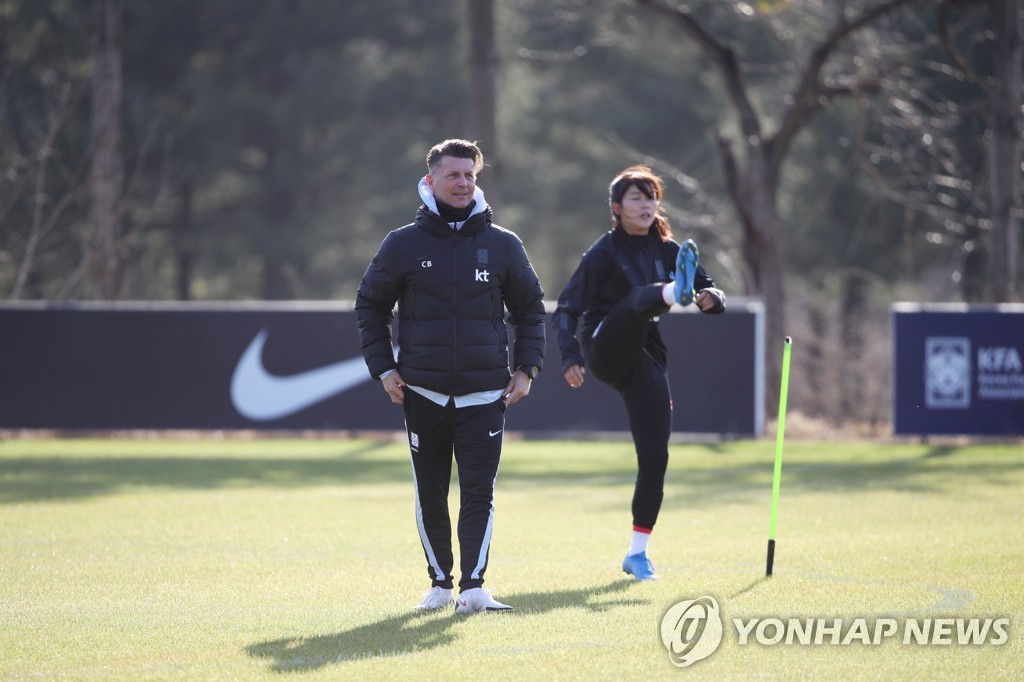 | ▲ In this file photo from March 22, 2021, Colin Bell (L), head coach of the South Korean women's national football team, watches his players during practice at the National Football Center in Paju, Gyeonggi Province, in preparation for Olympic qualifying playoff matches against China. (Yonhap) |