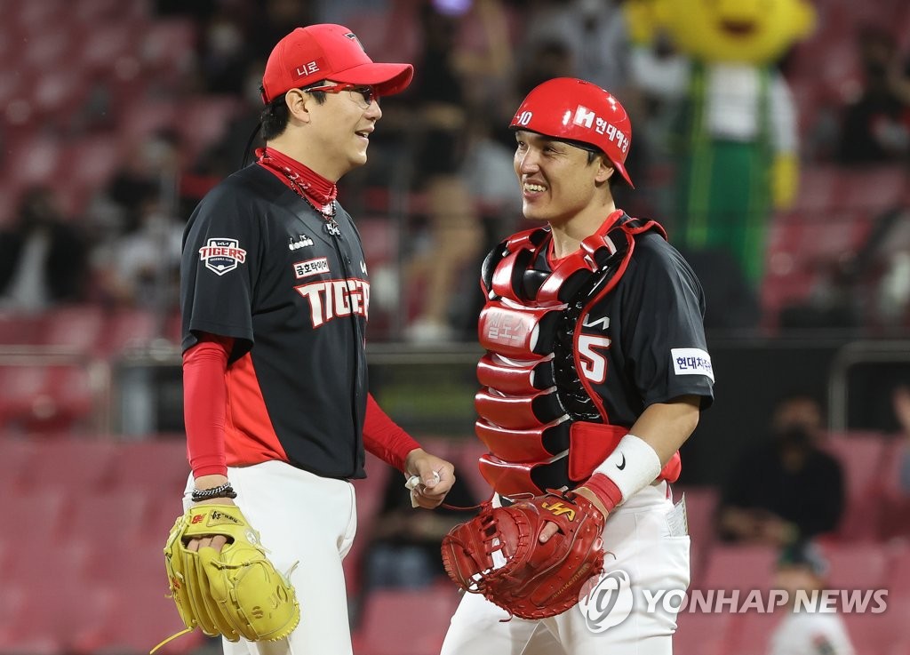 | ▲  Yang Hyeon-jong of the Kia Tigers (L) shares a smile with his catcher Park Dong-won before leaving the mound during the bottom of the seventh inning of a Korea Baseball Organization regular season game against the KT Wiz at KT Wiz Park in Suwon, 45 kilometers south of Seoul, on April 26, 2022. (Yonhap) |