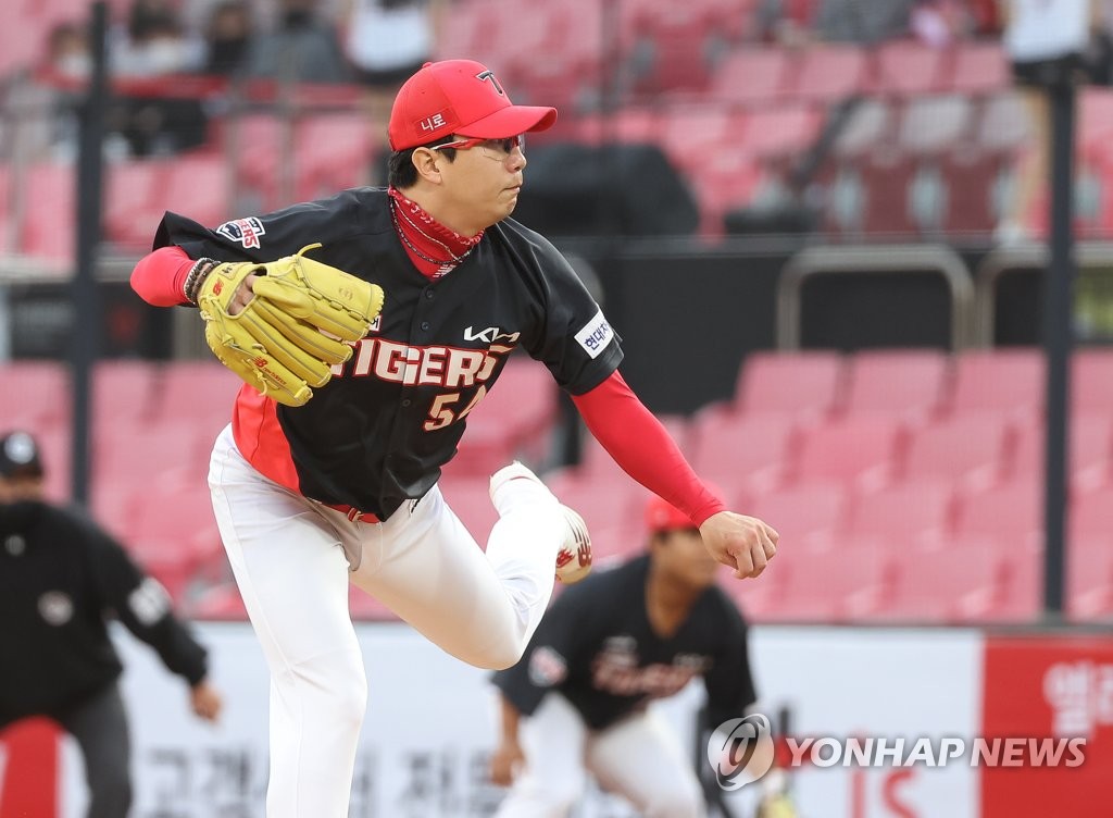 | ▲  Yang Hyeon-jong of the Kia Tigers pitches against the KT Wiz during the bottom of the first inning of a Korea Baseball Organization regular season game at KT Wiz Park in Suwon, 45 kilometers south of Seoul, on April 26, 2022. (Yonhap) |