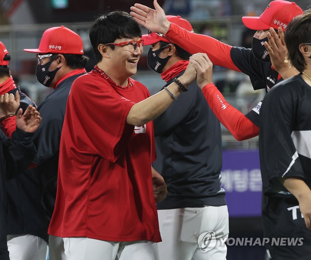 | ▲  Yang Hyeon-jong of the Kia Tigers (C) is congratulated by teammates after picking up his first win of the 2022 Korea Baseball Organization season against the KT Wiz at KT Wiz Park in Suwon, 45 kilometers south of Seoul, on April 26, 2022. (Yonhap) |