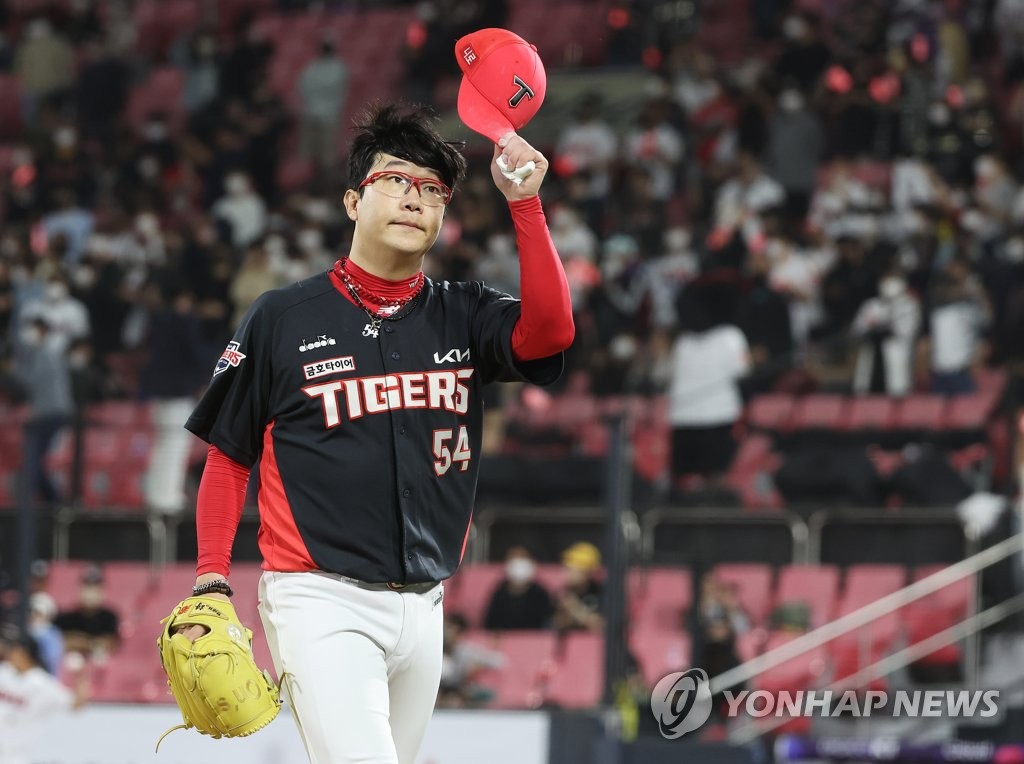 | ▲  Yang Hyeon-jong of the Kia Tigers tips his cap toward fans as he leaves the mound during the bottom of the seventh inning of a Korea Baseball Organization regular season game against the KT Wiz at KT Wiz Park in Suwon, 45 kilometers south of Seoul, on April 26, 2022. (Yonhap) |