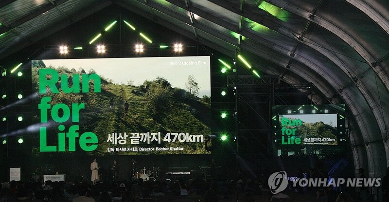 ▲ 울산울주세계산악영화제 폐막작 상영 (울산=연합뉴스) 장영은 기자 = 26∼30일 울산 울주군에서 열린 국내 유일 국제산악영화제인 제10회 울산울주세계산악영화제에서 폐막작 '세상 끝까지, 470km'가 상영되고 있다. 다큐멘터리 레바논 작품으로 딸을 치료하기 위해 울트라마라톤에 뛰어든 한 아버지의 가슴 따뜻한 사랑 이야기를 담았다. 2025.9.30 young@yna.co.kr