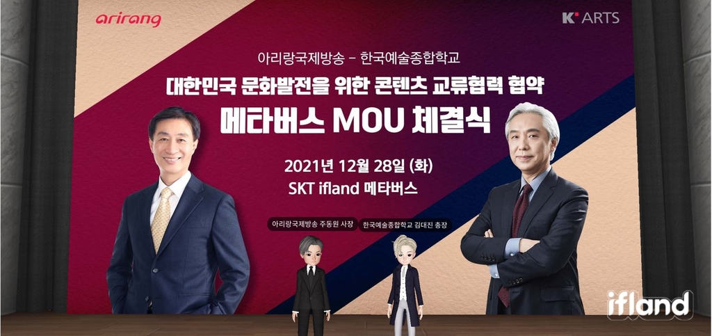▲ 아리랑TV, 한예종과 메타버스서 업무협약 = 아리랑TV와 한국예술종합학교(이하 한예종)가 28일 SK텔레콤 메타버스 플랫폼 이프랜드에서 '신한류 콘텐츠 발굴 및 문화발전을 위한 상호협력'에 관한 업무협약을 체결했다.