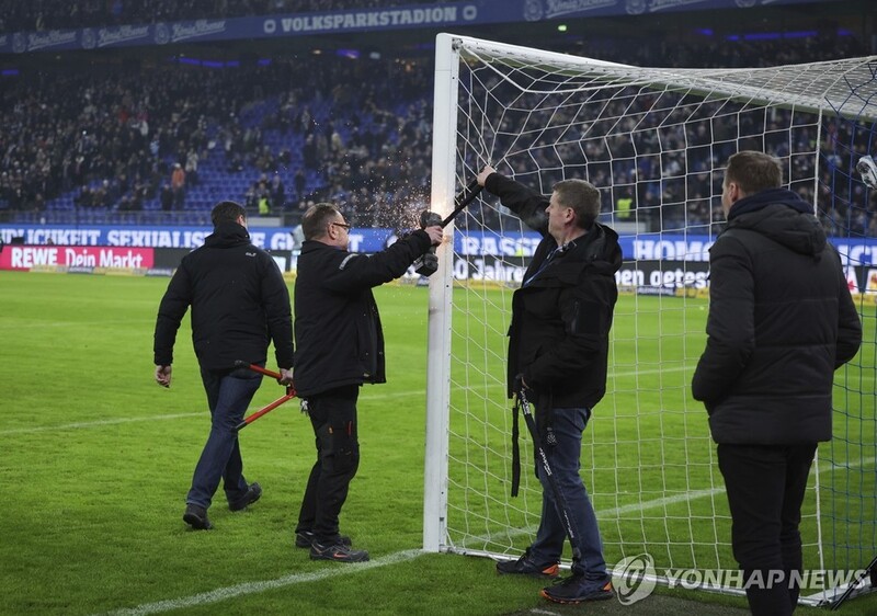 | ▲ 함부르크-하노버 경기 중 골대에 채워진 자물쇠 제거하는 관계자들 [Christian Charisius/dpa via AP=연합뉴스] |