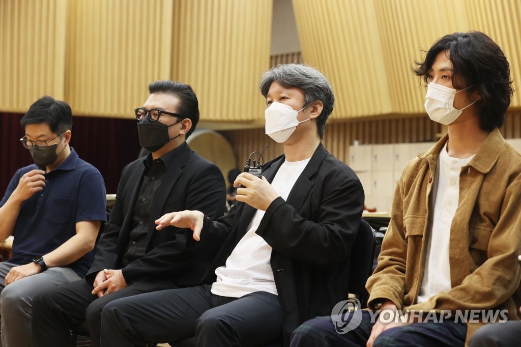 | ▲ 인사말하는 김성국 예술감독 (서울=연합뉴스) 강민지 기자 = 김성국 예술감독이 21일 오전 서울 종로구 세종문화회관 예술동에서 믹스드 오케스트라 '충돌과 조화' 공개 시연회에서 인사말을 하고 있다. 왼쪽부터 제임스 라 작곡가, 장석진 작곡가, 김성국 예술감독, 황린 일렉트릭 기타 연주가. 2022.9.21 mjkang@yna.co.kr |