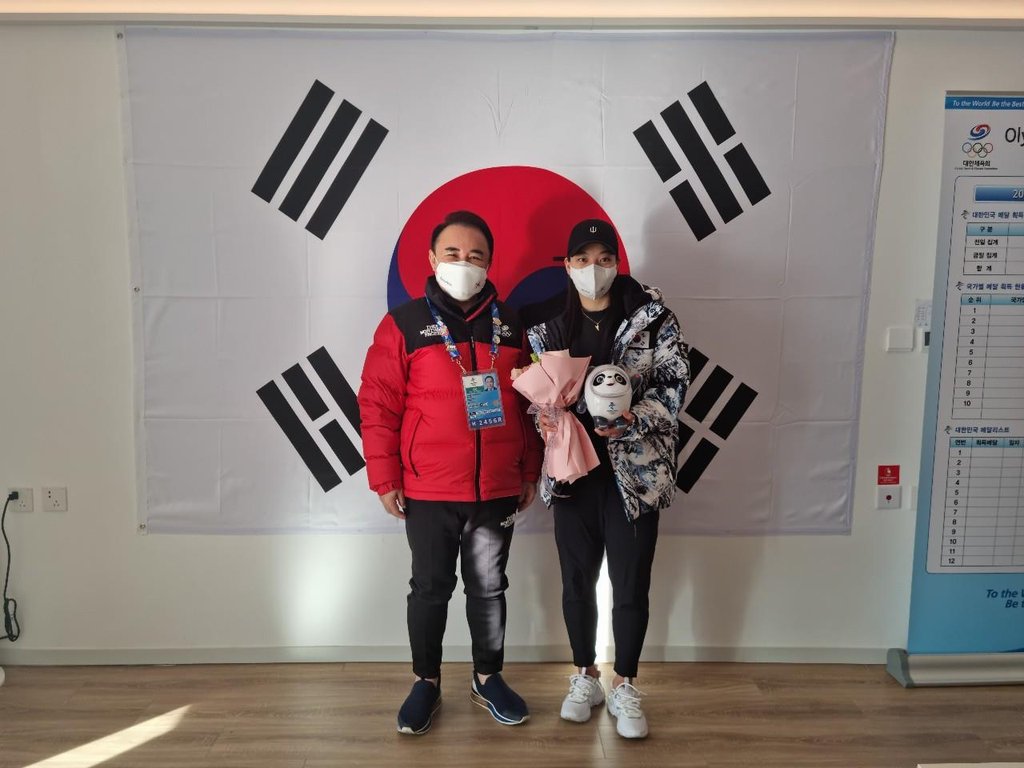 Before her training session on Sunday, Kim received a bouquet of flowers and a stuffed doll of the panda Olympic mascot, Bing Dwen Dwen, from the head of the athletic delegation, Yoon Hong-geun.